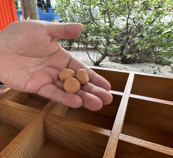 満願石の穴に願いを込めて玉を投げ、うまいこと穴に入れば願いが叶うといわれてます。