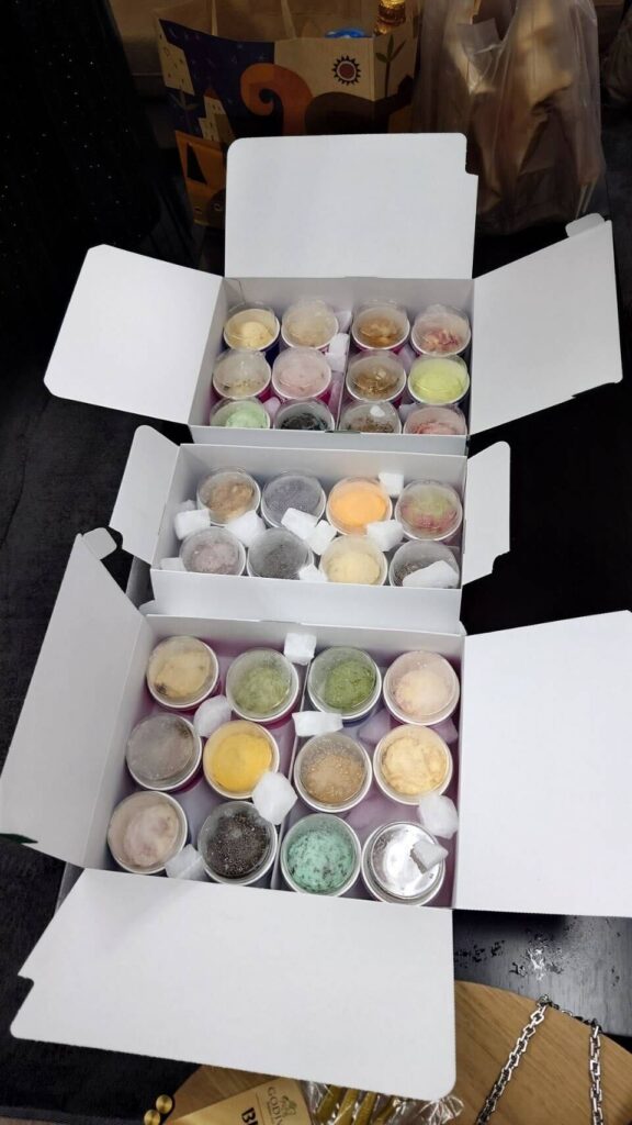 大量のアイスが溶けないようクーラーボックスで冷やしつつ、ひとつまたひとつと着実に食べて行きます。