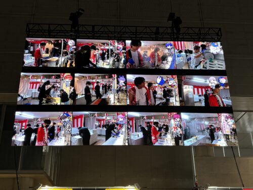ドでかサイネージに働く配信者やゲーマーたちが映る