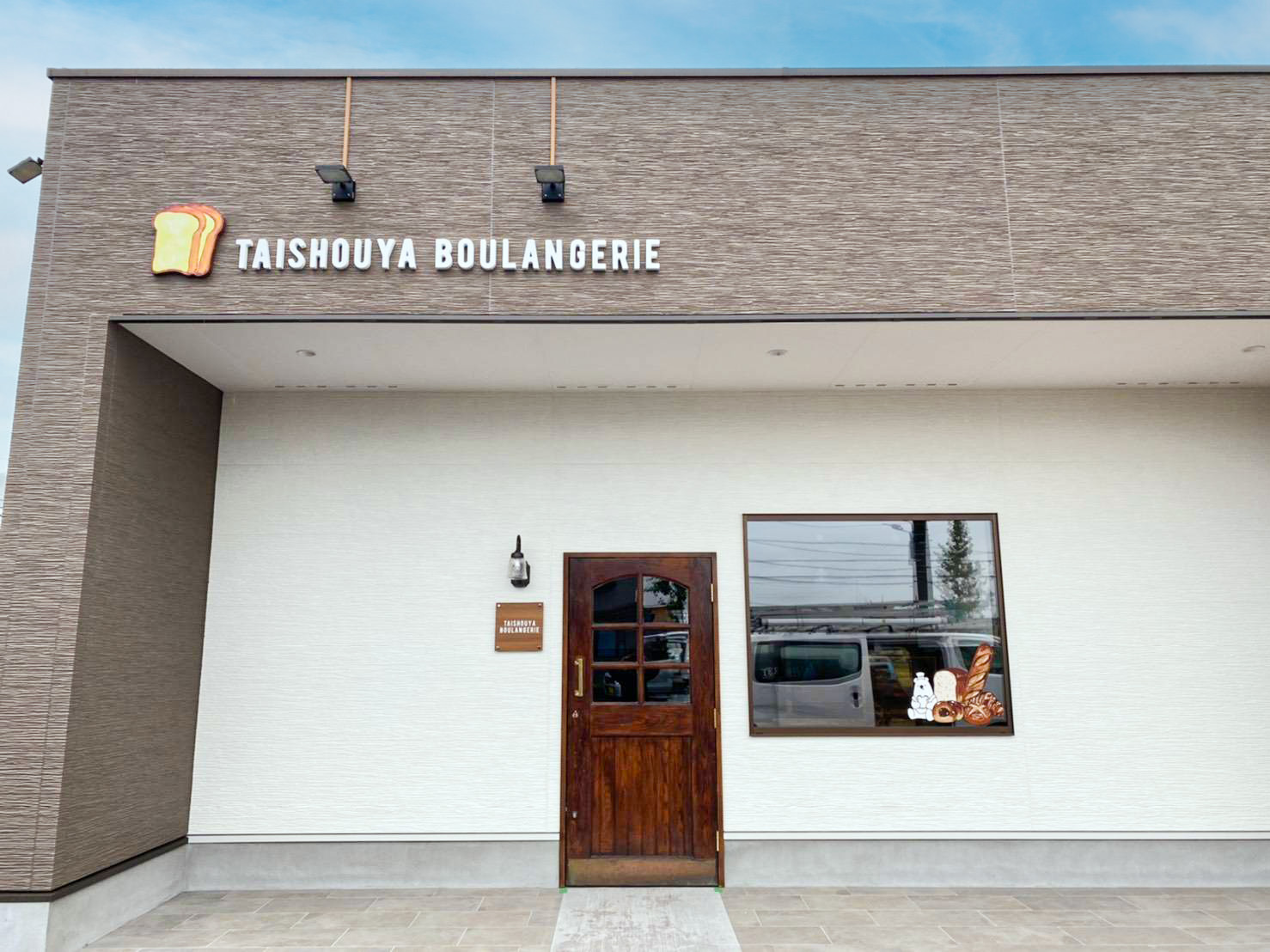 壁面にはパンの立体サインをリズミカルに配置し、専門店としての楽しさと品質感を表現。敷地入口にはアイキャッチとなる自立看板を設け、遠方からの視認性と誘導性を高めております。