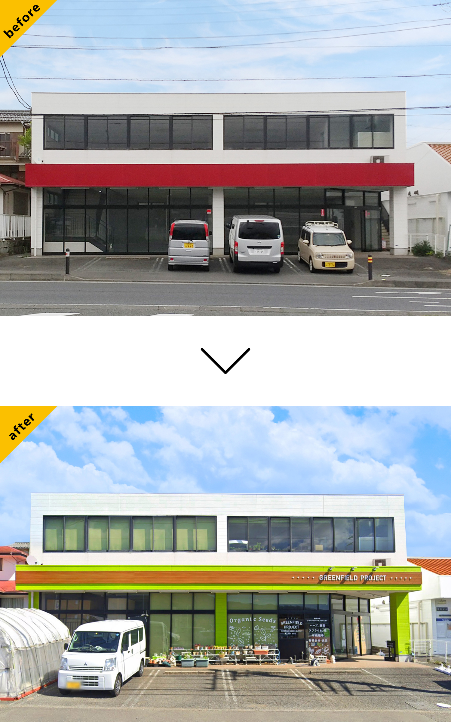 壁面をグリーンに塗装し、看板を設置することでイメージがガラリと変わりました。